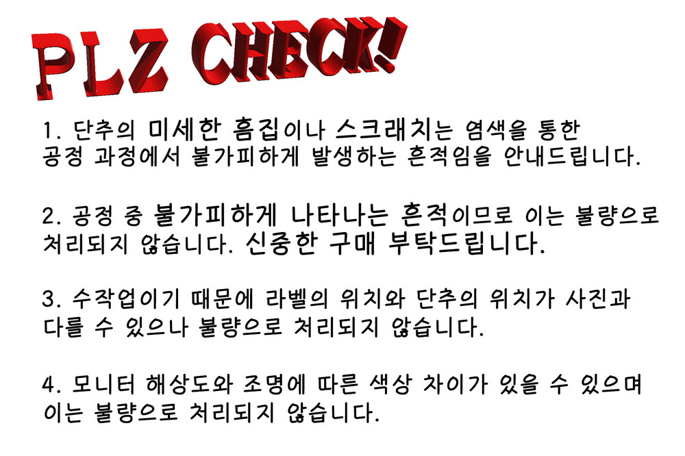 단추의 미세한 흠집이나 스크래치는 염색을 통한 공정과정에서 불가피하게 발생하는 흔적임을 안내드리며 이는 불량으로 처리되지 않습니다.
